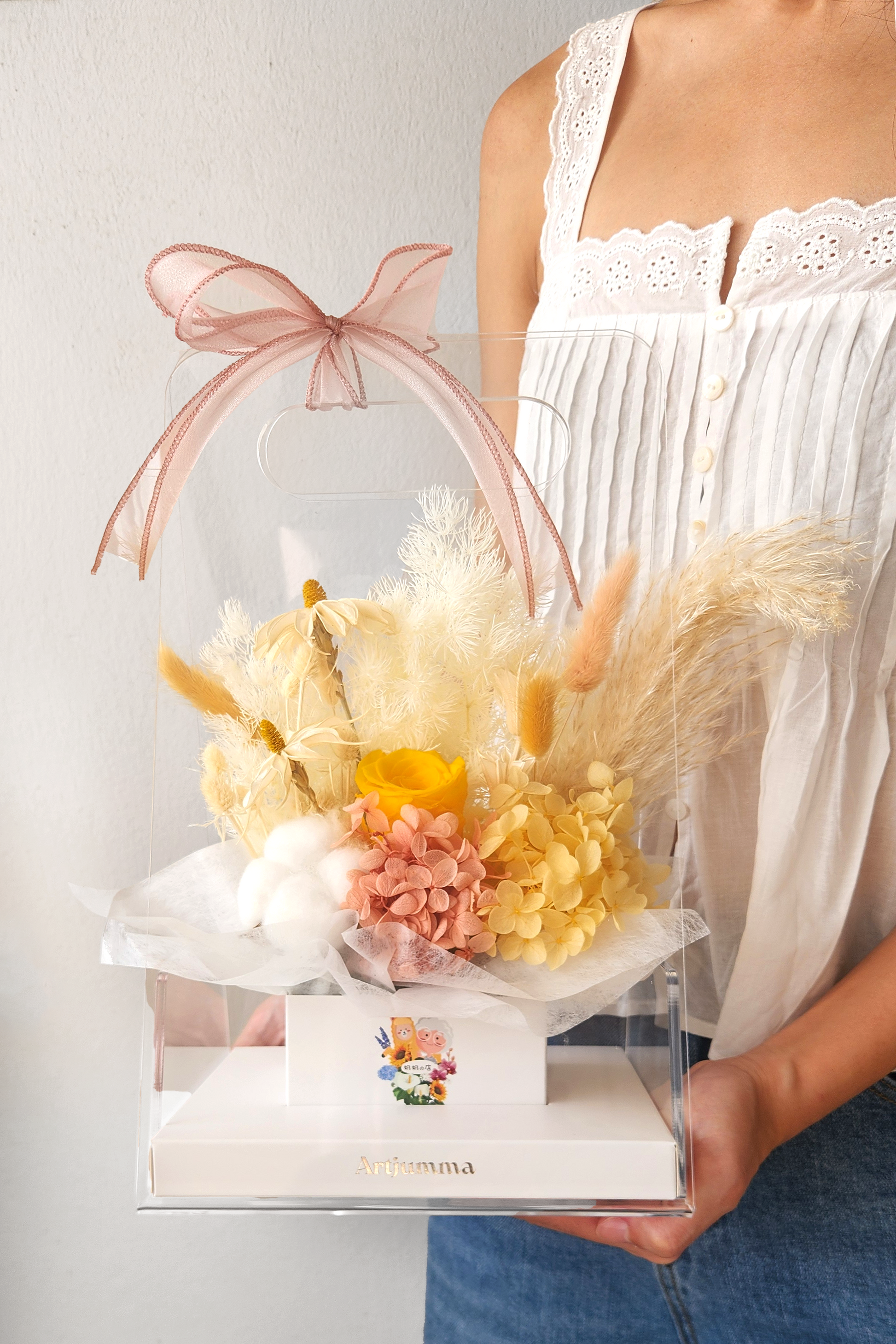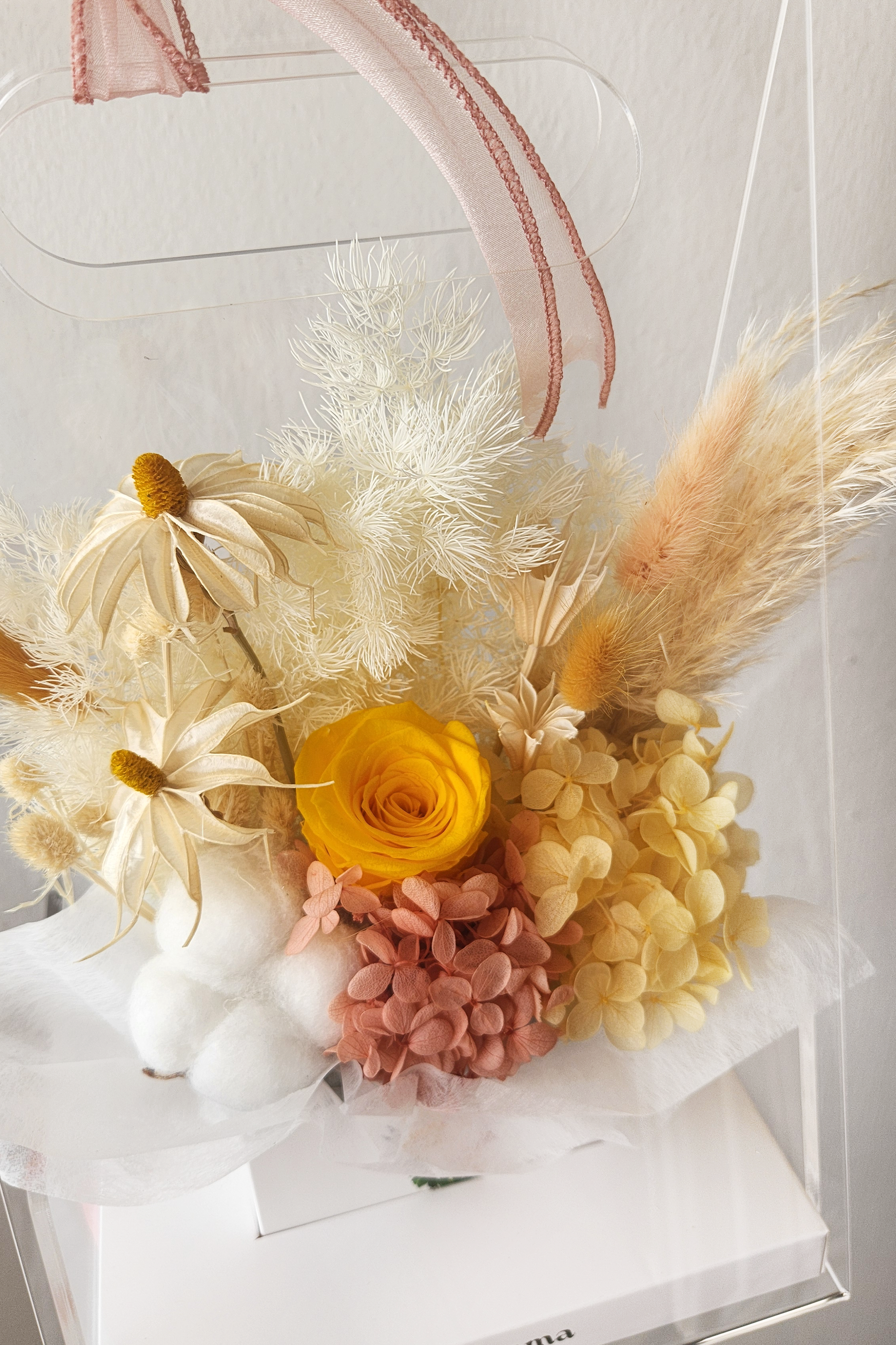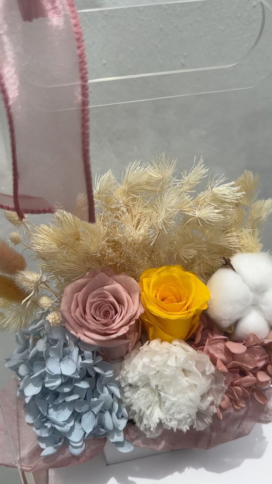 Flowers in this arrangement are handcrafted with natural elements and preserved using drying techniques, these flowers last up to 12 months with proper care. Slight variations in appearance may occur.